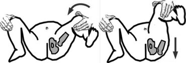 О симптоме «щелчка» (симптом соскальзывания, симптом неустойчивости, симптом вправления и вывихивания, симптом «перескока») упоминают Roser W. (1879), Joochimstal G. (1908) и Le Damany (1912). В середине 30-х годов в Италии и СССР независимо друг от друга Маркс В.0. (1934) и Ortolani M. (1935) широко применяли симптом «щелчка» при массовом обследовании грудных детей. Симптом объясняется достаточно легким вправлением и вывихиванием головки бедра из вертлужной впадины в связи с растянутым капсульно-связочным аппаратом ТБС, в результате чего головка бедра перекатывается через возвышение края вертлужной впадины (рис.4). Выявляется данный симптом у 3-4 детей на 100 родившихся, а диагноз дисплазии подтверждается клинически и рентгенологически лишь в 60% случаев. С ростом ребенка данный симптом утрачивает свое значение, он становится непостоянным в связи с прогрессированием изменений в ТБС, растянутая капсула быстро сокращается и нарастает приводящая контрактура бедра. Поэтому у детей старше 2-3 недель этот симптом встречается только в 25% случаев [7,17,30,40].