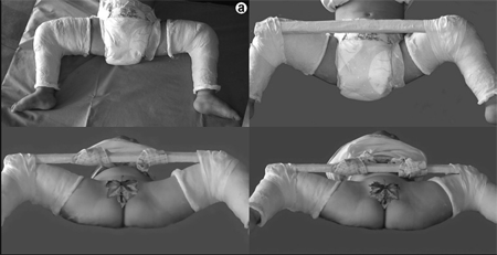 Рис.1. Этапы лечения по Тер-Егиазарову: а. наложение гипсовых повязок на обе н/к, б. больной в ФГП, в. ограниченное разведение ТБС при ВВБ слева, г. при тракции конечности вывих слева вправлен