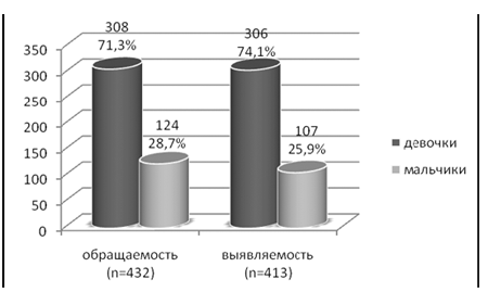 Диаграмма 1. Распределение обращаемости и выявляемости дисплазии ТБС у младенцев, обратившихся в НЦТО