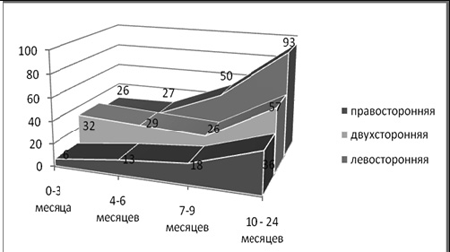 Резюмируя вышеизложенное можно сказать, что с ростом ребенка клинические проявления становятся настолько явными, что неопытный глаз родителя улавливает их. В итоге, мы имеем повышенную обращаемость и выявляемость в старшей возрастной группе, а, как известно, в этой возрастной группе прогноз консервативного и оперативного лечения менее благоприятен. Анализ данных преимущественной стороны поражения показывает, что до 6 месячного возраста левосторонняя и двухсторонняя дисплазия встречаются практически одинаково, а у младенцев старше 6 месячного возраста наблюдается резкое превалирование левосторонней. Правосторонняя дисплазия во всех группах значительно уступает как левосторонней, так и двухсторонней дисплазии ТБС (диаграмма 3).