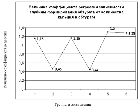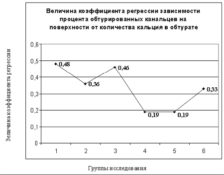 Так, оказалось, что при спонтанном течении формирования обтурата при условии увеличения содержания кальция в обтурате на 1 единицу, в свою очередь, глубина формирования обтурата увеличится на 1,15 микрон, а в группе гексафторсиликата глутаминовойкислоты -1,16. Кроме того, зависимость процента обтурированных канальцев от содержания кальция в обтурате также имеет примерно такую же картину в отмеченных группах (соответственно 0,48 и 0,46). Для большей наглядности указанные тенденции представим в виде диаграмм (1 и 2).