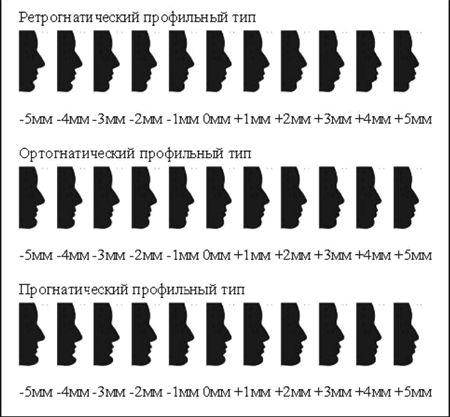 Czamecki [4] профиль был полностью затемнен во избежание влияния на его оценку таких факторов, как: цвет кожи, форма глаз и их расположение, контуры красной каймы губ, положение, размер и форма бровей и т.д. После получения усредненного силуэта при помощи программы Adobe Photoshop CS, были проведены изменения лицевого угла, путем пе-ремещения нижней челюсти в сагиттальной плоскости, с целью создания различных профильных типов - по рекомендациям Coleman [3] - +10 градусов для прогнатического и -10 - для ретрогнатического типа. В дальнейшем для каждого профильного типа,посредством перемещения губ строго в сагиттальной плоскости, с последующим морфингом искажений, была создана серия профилей, отражающая спектр положения губ от -5 до +5мм. (рис. 3) Те же процедуры были проведены для серии женских силуэтов. При помощи программы PowerPoint были изготовлены 12 презентаций, 6 ознакомительных и 6 манипулируемых, в которых силуэты были пронумерованы