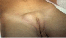 Мы представляем случай эндометроидной кисты Нака у больной 27 лет N И.Б. 1477149, поступившей в наше отделение с жалобами на резкие распирающие боли в области верхней трети левой большой половой губы и по проекции нижней трети пахового канала. Здесь же пальпируется опухолевидное образование, умеренно подвижное, с гладкой поверхностью. При пальпации резко болезненное. Поверхность кожи над образованием интактна. При натуживании и кашлевой пробе признаков грыжевой экскурсии не отмечается. Со слов пациентки это образование существует в течение последних 3 лет. Отмечается характерное увеличение размеров и болезненности образования в предменструальном и менструальном периоде. Надо отметить, что за 2 месяца до поступления больная находилась в нашем отделении по поводу первичного бесплодия, где ей была произведена диагностическая лапароскопия.