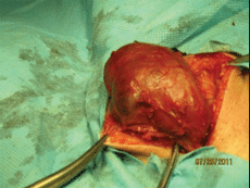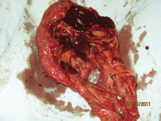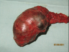 Удаленный препарат представляет собой гладкостенную кисту овоидной формы, размерами 6,2x3,4см. На разрезе: множественные перегородки и полости, заполненные густой геморрагической жидкостью, похожей на “жидкий шоколад”. Больная выписана на третьи сутки в хорошем состоянии. При последующих посещениях какой-либо патологии в зоне оперативного вмешательства не выявлено.
