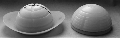 Правильная техника цементировки вертлужного компонента может помочь избежать ненужных погрешностей и осложнений. Желательно использовать имеющиеся в производстве ацетабулярные кубки с цементными спейсерами (рис. 3), которые упираются в дно впадины и позволяют образовывать более или менее равномерную цементную мантию.