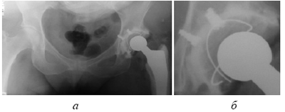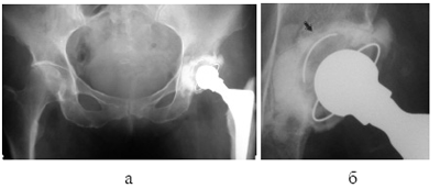 1998)(рис. 2б), что приводит к нестабильности, во-вторых, в зоне контакта импланта (полиэтилен или металл) может наблюдаться остеолиз (Pazzalgia U.E. et al., 1985; Barrack R.L. et al., 1997; Nizegorodcew T., Gasparini G. et al., 1997), что опять же приводит к расшатыванию, и в-третьих, к неправильным углам установки кубка (Judet T., 1997; Sanchez-Sotelo J., 2002), что чревато вывихами, ограничением движений и даже расшатыванием кубка, вследствие действия неправильных биомеханических сил.