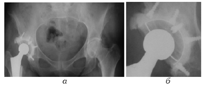 Рис. 5. Использование позиционирующих винтов (случай 1): а. тотальное цементное эндопротезирование левого ТБС, б. тот же снимок в увеличении - позиционирующие винты в дне впадины