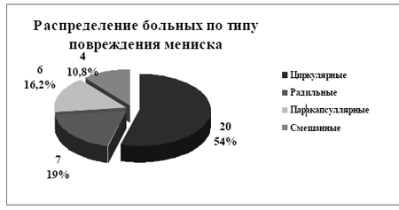 Результаты и обсуждение. До представления анализа наших результатов следует заметить, что во всех случаях нами была проигнорирована классификация, посвященная хронологической давности повреждения мениска. Оценка степени застарелости производилась визуально, во время артроскопии, однако в противоположность вы-шеизложенному, во всех случаях на поврежденный участок мениска ставился шов, после чего была произведена оценка не только состоятельности шва, но и функциональная стабильность мениска. Таким образом, решающим моментом являлась не давность повреждения, а состояние ткани мениска на момент реконструкции, т.е. было принципиальным максимально возможное сохранение мениска как органа и как функциональной единицы. Как видно из представленной диаграммы, в группе прооперированных больных наибольшее количество составляли циркулярные повреждения 20(54%), далее следовали радиальные 7(19 %), паракапсулярные 6 (16,2%) и смешанные 4 (10,8%) (диаг рам ма 1).