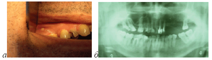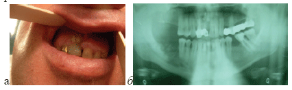 Рис.2. Больной Б., применяющий наркотик “крокодил” (дезоморфин), а) оголение кости в области зуба 16, б) на ортопантомограмме больного картина хронического периодонтита зуба 16.