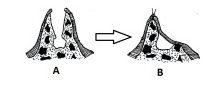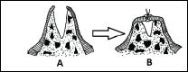 Рис.4. Схематическое изо-бражение операции удаления зуба по 2-ому варианту у больных применяющих наркотик “крокодил” (дезоморфин). А) лунка после удаления зуба, В) лунка после укорочения ее стенок