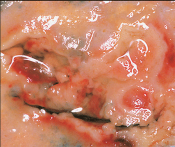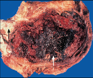Возможно, большую опасность, чем собственно гипоперфузия, представяет «реперфузионное повреждение», приводящее к более грубому повреждению эпителиальных клеток ЖКТ. Этот феномен описан при непродолжительных, но повторяющихся эпизодах ишемии кишечника. Считается, что именно реперфузионное повреждение играет ведущую роль в формировании у больных синдрома острой неокклюзивной мезентериальной ишемии. Значительное повышение проницаемости слизистой оболочки, возникшее в ответ на ишемию и реперфузионные повреждения, приводит к ускорению абсорбции токсинов из просвета кишки [10,24,25,42,45,51,63]. При ишемии брыжейки возможно развитие субэпителиального отека слизистой оболочки кишечника и, как следствие, потеря эпителиальной выстилки верхушек ворсинок. При острой ишемии брыжейки с поражением стенки кишки высокая летальность обусловлена развивающимся при этом некрозом кишки и септическим шоком [16,31]. При более выраженной ишемии может иметь место трансмуральный некроз стенок органов ЖКТ (рис. 4,5).