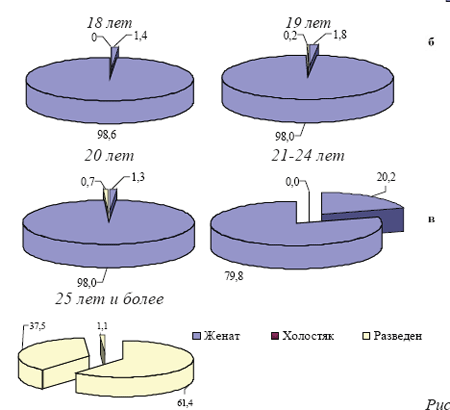 - 19-летние лица достоверно превышают 18-летних, показатель 20-летних имеет тенденцию к снижению, а 21-24 и 25 лет и более группы достоверно меньше первой группы;