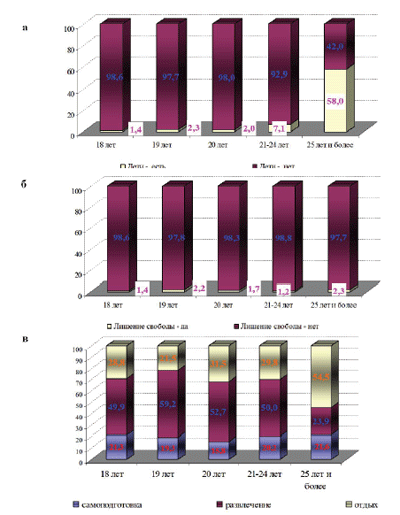 Рис. 3. Распределение респондентов по возрасту с учетом а) наличия детей, б) лишения свободы, в) формы проведения свободного времени (%) (продолжение)