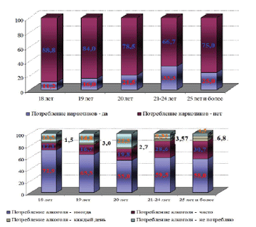 Рис. 3. Распределение респондентов по возрасту с учетом а) потребления наркотиков, б) потребления алкоголя (%) (продолжение)