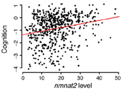 Из-за неправильной укладки белков те становятся клейкими и образуют отложения. NMNAT2 привязывается к неправильно уложенным белкам, тем самым, предотвращая или исправляя ошибки, вызывающие формирование отложений. Проверяя уровень NMNAT2 в мозге более 500 пожилых людей, чей когнитивный статус анализировали каждый год вплоть до смерти, начиная с 1997 года, ученые выяснили: высокий уровень NMNAT2 наблюдался у людей, лучше противостоявших когнитивному упадку.