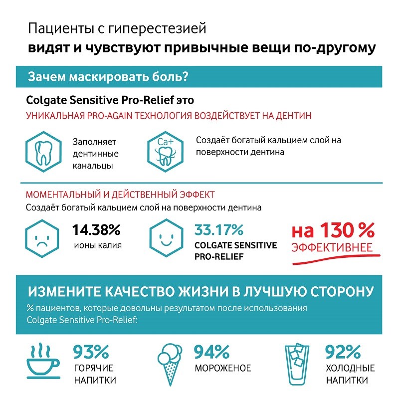 А это значит, что 93% пациентов теперь спокойно пьют горячие напитки, 92% - пьют холодные, а 94% с радостью наслаждаются любимым мороженым. В комплексе с правильной щеткой паста работает еще лучше. Обратите внимание на щетку Colgate "Шелковые нити" для глубокой и бережной чистки зубов. Выбирая столь необходимые вашим зубам средства по уходу, вы выбираете новое качество жизни. Без дискомфорта и пронизывающей зубной боли. Мгновенно и навсегда.