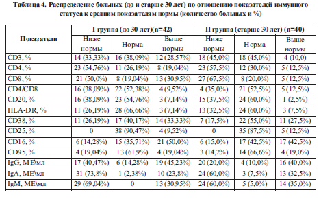 Заключение: Наиболее выраженная иммуносупрессия наблюдалась у больных старшей возрастной группы. Более чем у половины всех пациенток установлен повышенный уровень иммуноглобулинов IgG, IgA, IgM.