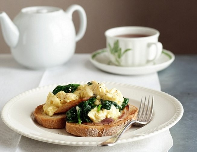 Еще один хороший вариант - яичница, сделанная из двух яиц, со шпинатом и столовой ложкой измельченного лука, которую можно поместить на цельнозерновой тост или съесть с ним вприкуску.