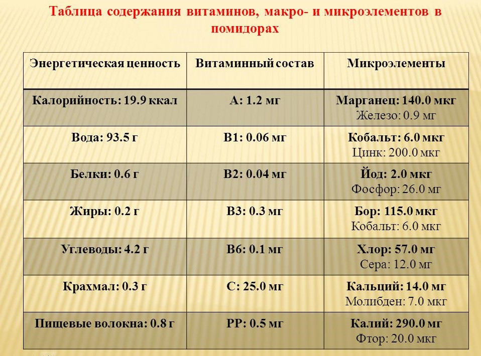 Хорошей новостью для заботящихся о своей фигуре является тот факт, что помидор – это низкокалорийный продукт. В 100 граммах ягоды содержится всего 22 килокалории. Поэтому помидор является составляющей множества различных диет.