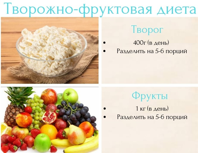 Одна из самых популярных диет из данной подборки, потому что является не только полезной, но и простой для привыкания. Сама программа состоит из употребления кисло-сладких фруктов и 400 гр творога в день. Фрукты с творогом можно есть как вместе, так и раздельно. Порции следует рассчитывать на 5-6 приемов. Длительность такой диеты составляет от 4 дней до 1 недели.