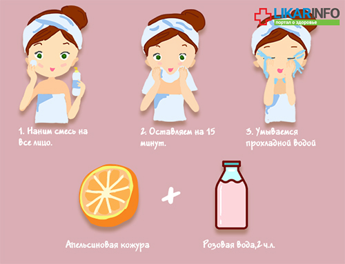 измельчите апельсиновую кожуру. добавьте к ней 2 ч.л. розовой воды (можно немного больше, до формирования пасты). нанесите смесь на лицо и оставьте на 15 минут. умойтесь прохладной водой.