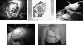 Частота осложнений была низкой (около 5%), осложнения обычно развивались у тех пациентов, у которых радикальному хирургическому вмешательству предшествовали неадекватные операции, как правило, в клиниках общей лечебной сети, в основном под местной анестезией, что противопоказано при лечении данного контингента больных. Основным критерием сохранения конечности являлся функциональный статус оперированной конечности. На наш взгляд, применение пластической и реконструктивной хирургии позволяет значительно расширить арсенал хирургического метода в лечении СМТ. Приводим следующий клинический случай. Больная Я. с диагнозом третий рецидив фибросаркомы передней грудной стенки справа в стадии распада после неадекватных оперативных вмешательств. Произведено оперативное вмешательство в объеме – широкое иссечение опухоли с транспозицией кожно-мышечного лоскута из m. rectus abdominis.