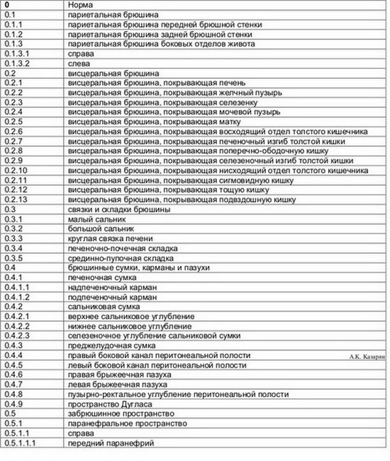 Заключение. Впервые предложена естественнонаучная классификация болезней и патологических состояний брюшины, полости брюшины, забрюшинного пространства и брюшной стенки, адаптированная для использования в диагностической радиологии и компьютерной обработки данных радиологических исследований. Составленный перечень вобрал в себя основные 5 групп заболеваний и патологических состояний указанных анатомических субстанций, представленных преимущественно с морфологических позиций и 2 группы заболеваний, схожих по отображенности на радиологических изображениях с остальными группами, в целях дифференциальной диагностики. Для удобства работы с классификацией предложены цифровые коды каталоговых и подкаталоговых наименований заболеваний.