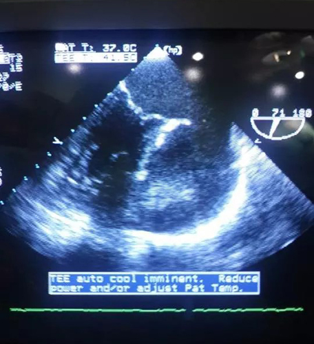 ЭхоКГ: Полостное образование размерами 7 x 8 см, сообщающееся с ушком левого предсердия и содержащее в своей полости округлое плотное образование размерами 5 x 6 см (тромб?). Образование сдавливает стенку левого предсердия и боковую стенку левого желудочка.